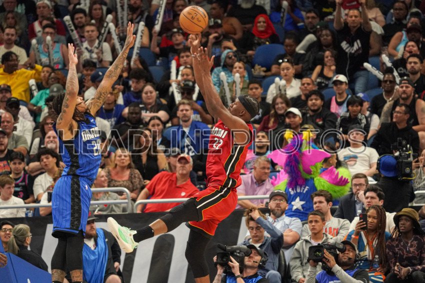 Orlando, Florida, USA, March 11, 2023, Miami Heat forward Jimmy Butler #22 shoots a three in the second half at the Amway Center. (Photo Credit: Marty Jean-Louis)