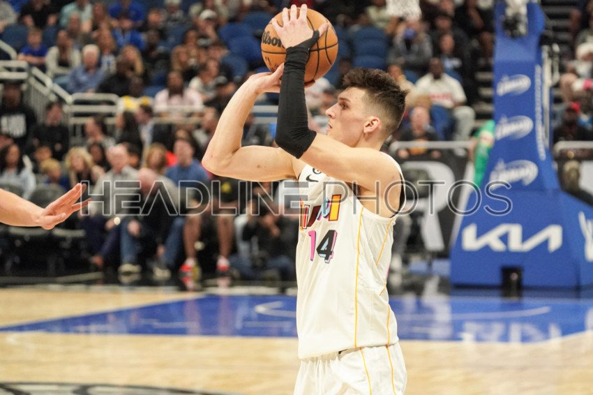Orlando, Florida, USA, February 11, 2023, Miami Heat guard Tyler Herro #14 shoots a three in the first half at the Amway Center. (Photo Credit: Marty Jean-Louis)