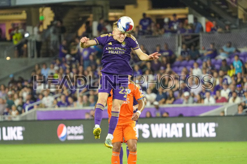 Orlando, Florida, USA, March 4, 2023, Orlando City SC player Dagur Dan Porhallsson #23 wins the header at Exploria Stadium. (Photo Credit: Marty Jean-Louis)