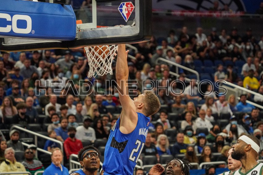 Orlando, Florida, USA, December 30, 2021, Orlando Magic Center Moritz Wagner #21 makes a dunk against the Milwaukee Bucks during the first half at the Amway Center. (Photo Credit: Marty Jean-Louis)