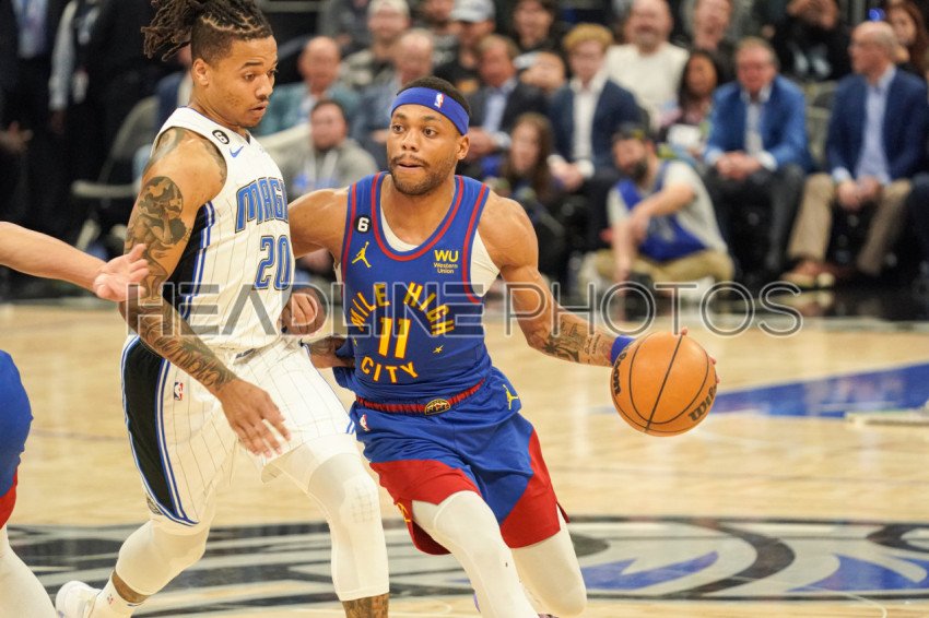 Orlando, Florida, USA, February 9, 2023, Denver Nuggets forward Bruce Brown #11 attempt to run pass Markelle Fultz #20 at the Amway Center. (Photo Credit: Marty Jean-Louis)