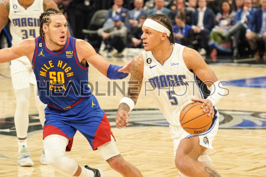 Orlando, Florida, USA, February 9, 2023, Denver Nuggets forward Aaron Gordon #50 and Orlando Magic forward Paolo Banchero #5 during the second half at the Amway Center. (Photo Credit: Marty Jean-Louis)