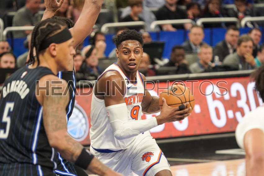 Orlando, Florida, USA, February 7, 2023, New York Knicks Guard RJ Barrett #9 attempt to run pass Magic players during the first half at the Amway Center. (Photo Credit: Marty Jean-Louis)