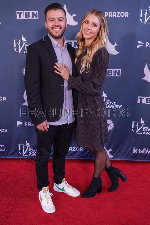 Nashville, Tennessee, USA, October 19, 2021. Evan Craft and his wife walk the Red Carpet during the 52nd Annual GMA Dove Awards at Allen Arena.
