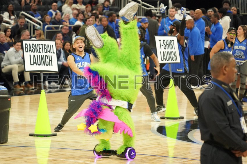 Orlando, Florida, USA, January 25, 2023, Orlando Magic Maskot Stuff The Magic Dragon having some fun at the Amway Center. (Photo Credit: Marty Jean-Louis) at the Amway Center. (Photo Credit: Marty Jean-Louis)