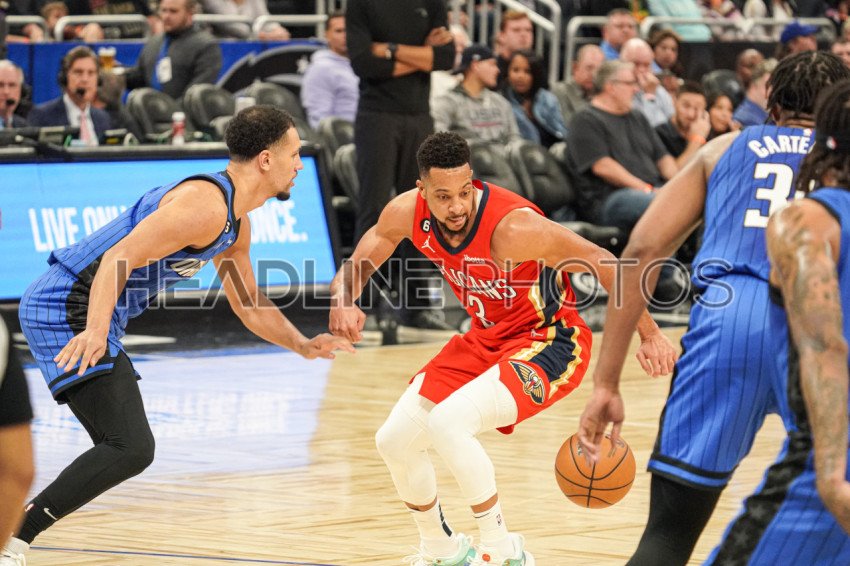 Orlando, Florida, USA, January 20, 2023, New Orleans Pelicans guard CJ McCollum #3 attempt to run pass Jalen Suggs #4 during the second half at the Amway Center. (Photo Credit: Marty Jean-Louis)