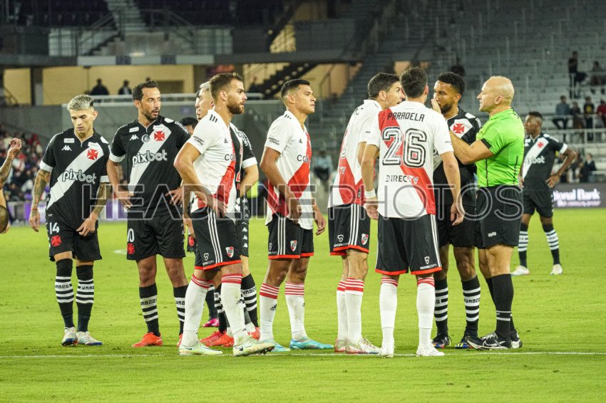 Orlando, Florida, USA, January 18, 2023, Referee gives instruction to River Plate and Vasco Da Gama players in a friendly match at Exploria Stadium. (Photo Credit: Marty Jean-Louis)