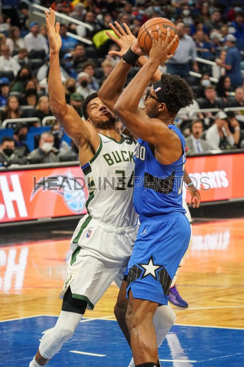 Orlando, Florida, USA, December 30, 2021, Orlando Magic Center Wendell Carter Jr #34 attempt to push pass Giannis Antetokounmpo #34 at the Amway Center. (Photo Credit: Marty Jean-Louis)