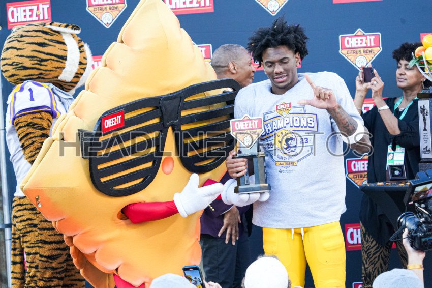 Orlando, Florida, USA, January 2, 2023, LSU player Malik Nabers #8 receives the MVP award during the Cheez-it Citrus Bowl at Camping World Stadium (Photo Credit: Marty Jean-Louis)
