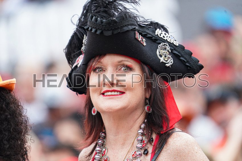 Tampa Bay, Florida, USA, January 1, 2023, Tampa Bay Buccaneers fan smiling during the game at Raymond James Stadium. (Photo Credit: Marty Jean-Louis)