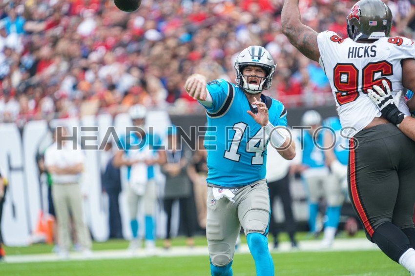 Tampa Bay, Florida, USA, January 1, 2023, Carolina Panthers quarterback Sam Darnold #14 makes a pass at Raymond James Stadium. (Photo Credit: Marty Jean-Louis)