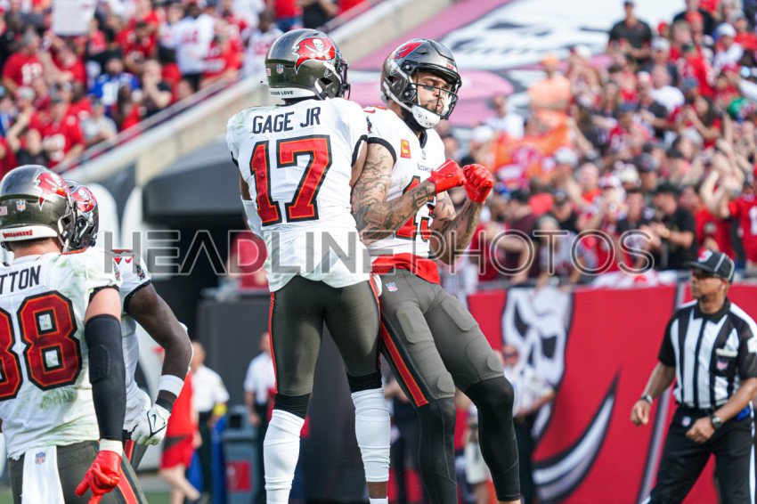 Tampa Bay, Florida, USA, January 1, 2023, Tampa Bay Buccaneers Wide Receiver Mike Evans #13 and Russell Gage Jr #17 celebrate after touchdown in the fourth at Raymond James Stadium. (Photo Credit: Marty Jean-Louis)