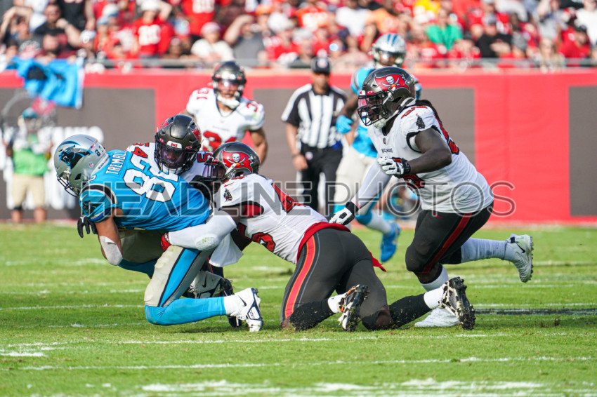 Tampa Bay, Florida, USA, January 1, 2023, Carolina Panthers face Tampa Bay Buccaneers Tide End Tommy Tremble #82 gets tackled in the fourth at Raymond James Stadium. (Photo Credit: Marty Jean-Louis)