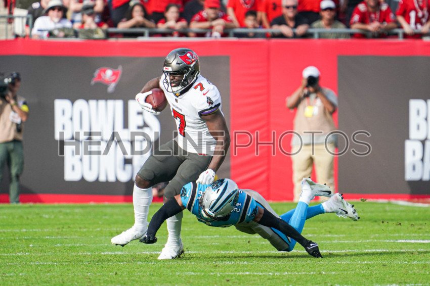 Tampa Bay, Florida, USA, January 1, 2023, Tampa Bay Buccaneers Running back Leonard Fournette #7 makes a run and tries to avoid a tackle in the fourth at Raymond James Stadium. (Photo Credit: Marty Jean-Louis)