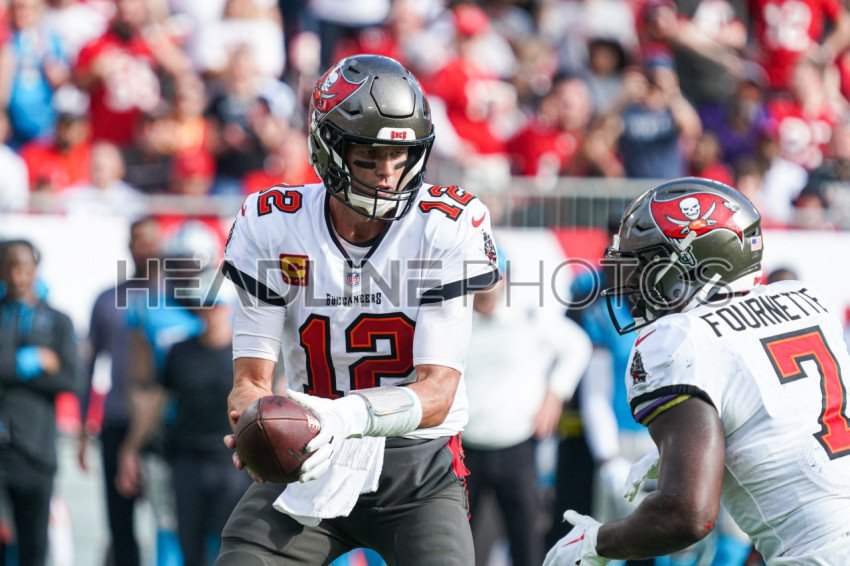 Tampa Bay, Florida, USA, January 1, 2023, Tampa Bay Buccaneers Quaterback Tom Brady #12 makes a pass to Runningback Leonard Fournette #7 during the 3rd quarter at Raymond James Stadium. (Photo Credit: Marty Jean-Louis)