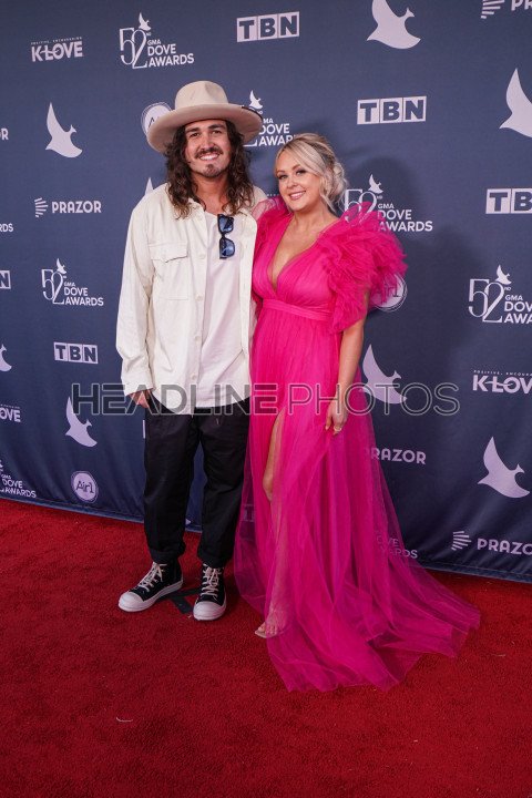 Nashville, Tennessee, USA, October 21, 2021. Jordan Feliz and his wife walk the Red Carpet during the 52nd Annual GMA Dove Awards at Allen Arena.