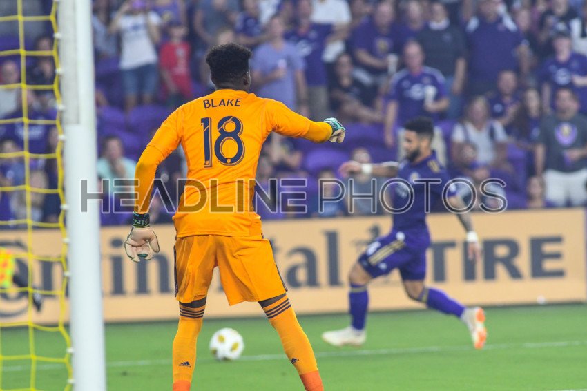 Philadelphia Union Goalie Andre Blake (18) readies for Orlando City's Dom Dwyer (14) - Orlando City Stadium September 1, 2018