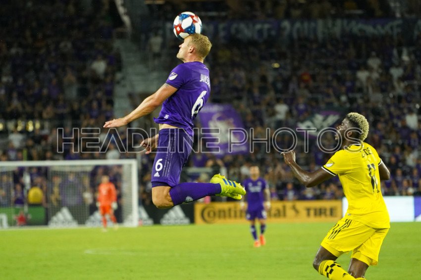 Orlando City's defender Robin Jansson makes a header away from the goal at Exploria stadium in Orlando, Florida on Saturday July 13, 2019. Photo Credit: Marty Jean-Louis