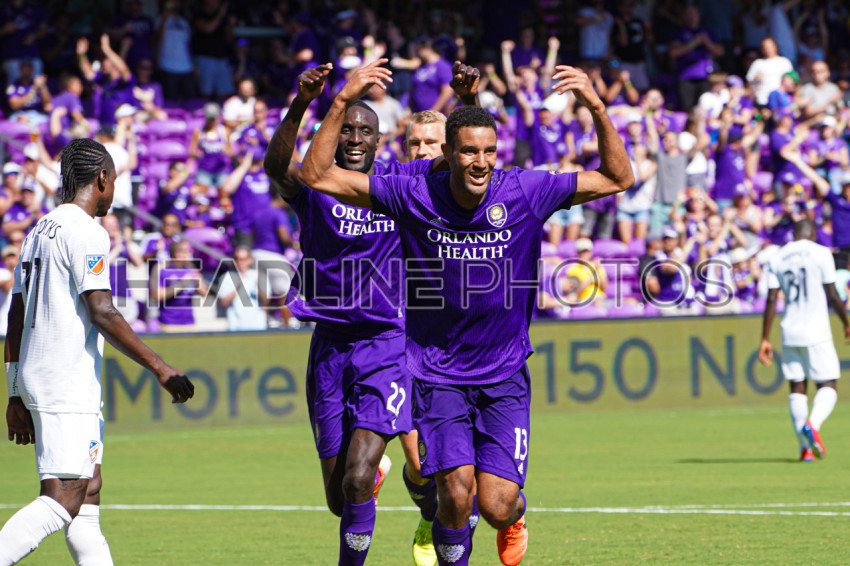 Tesho (13) and Lamine Sane (22) celebrate goal at Orlando City Stadium on May 19, 2019. Photo Credit: Marty Jean-Louis