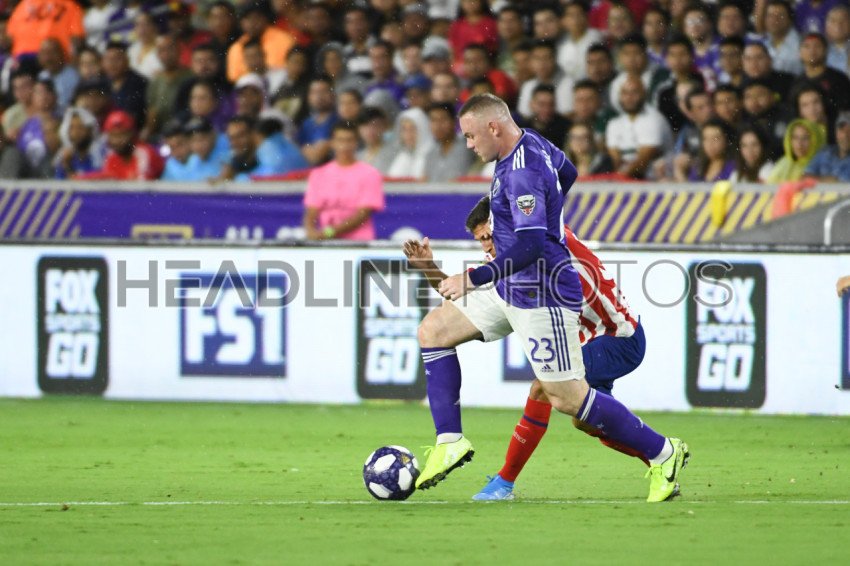 Wayne Rooney (23) runs pass an Atletico De Madrid defender during the all star game at Exploria Stadium in Orlando, Florida on Wednesday July 31, 2019. Photo Credit: Marty Jean-Louis