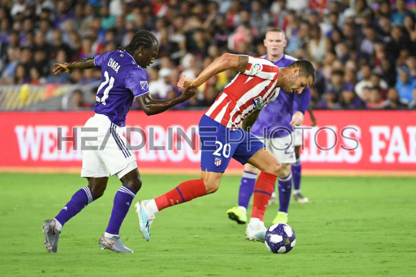 Atletico Madrid's Vitolo (20) run pass Diego Chara (21) during the all star game at Exploria Stadium in Orlando, Florida on Wednesday July 31, 2019. Photo Credit: Marty Jean-Louis