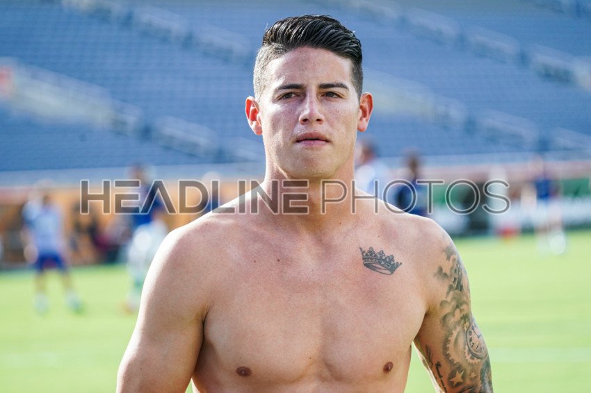 Orlando, Florida, USA, July 25, 2021, Everton player James Rodriguez removes his shirt after warmup at Camping World Stadium. (Photo Credit: Marty Jean-Louis)