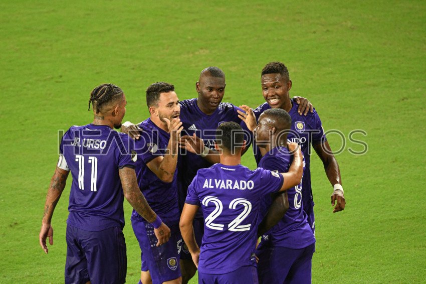 Orlando City players celebrate fourth goal of the match at Exploria Stadium in Orlando Florida USA on Wednesday October 28, 2020. Photo Credit: Marty Jean-Louis