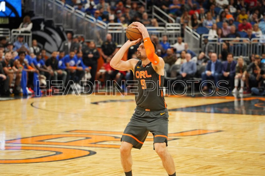 Orlando Magic player Nikola Vucevic #9 take a three point during the game at the Amway Center in Orlando Florida on Monday February 10, 2020. Photo Credit: Marty Jean-Louis