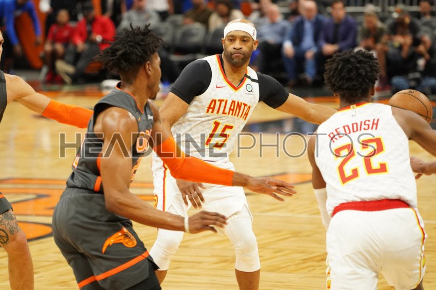 Atlanta Hawks player Vince Carter #15 passes the ball to Cam Reddish #22 during the game at the Amway Center in Orlando Florida on Monday February 8, 2020. Photo Credit: Marty Jean-Louis