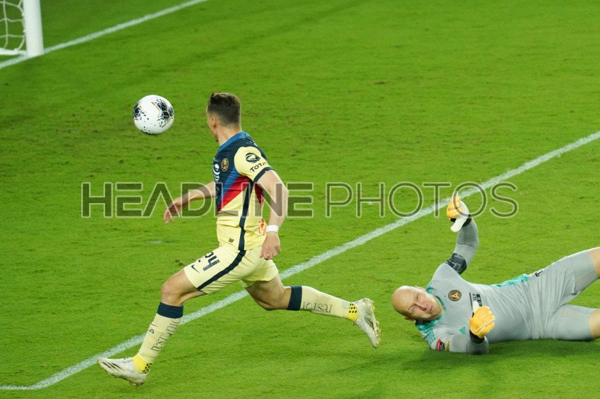 Orlando, Florida, USA, December 16, 2020, Club America forward Federico Vinas #24 runs pass Atlanta's Goalkeeper Brad Guzan #1 during the CONCACAF Quarter Final. (Photo Credit: Marty Jean-Louis)