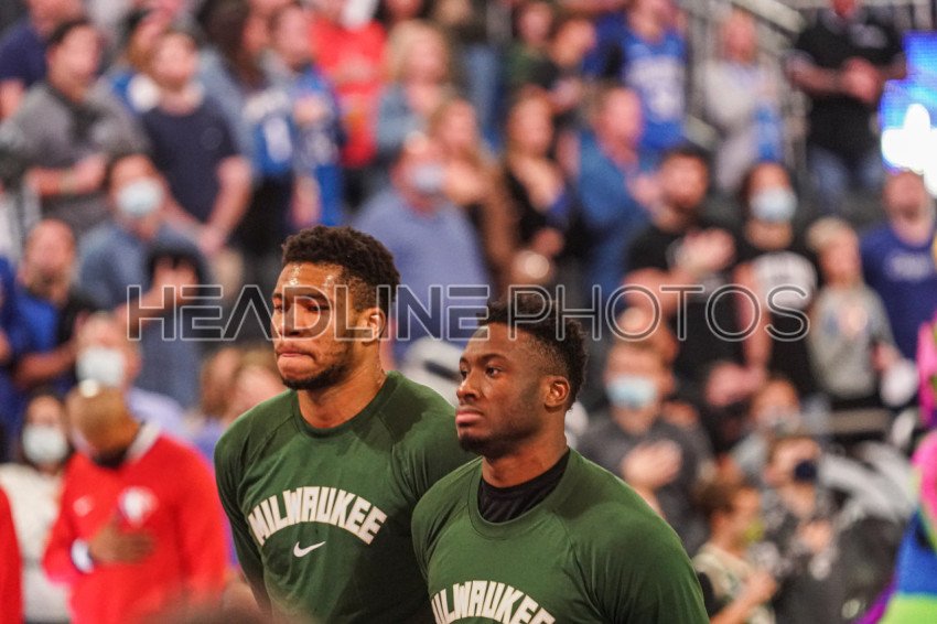 Orlando, Florida, USA, December 28, 2021, Milwaukee Bucks Forward Giannis Antetokounmpo #34 and his brother Thanasis Antetokounmpo #43 during the National Anthem at the Amway Center. (Photo Credit: Marty Jean-Louis)
