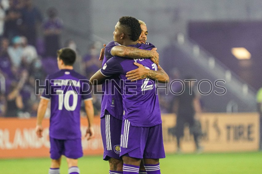 Orlando, Florida, USA, August 4, 2021, Orlando City SC players Andres Perea and Mauicio Pereya hugs before the opening whistle at Exploria Stadium. (Photo Credit: Marty Jean-Louis)