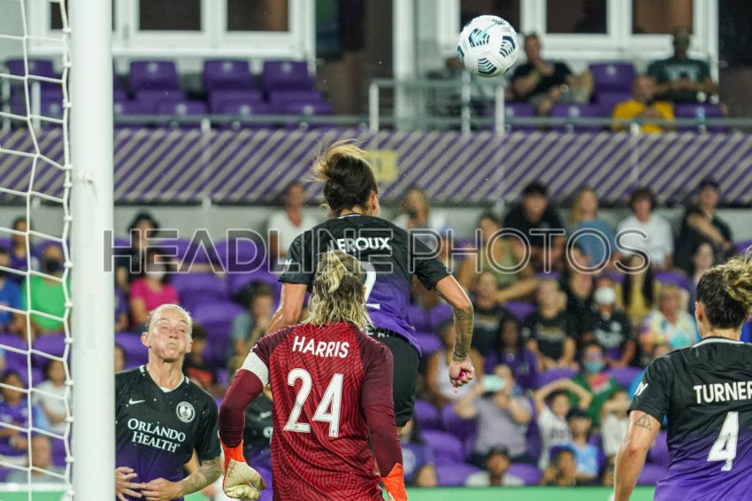 Orlando, Florida, USA, August 14, 2021, Orlando Pride player Sydney Leroux #2 defends the ball with a header at Exploria Stadium. (Photo Credit: Marty Jean-Louis)