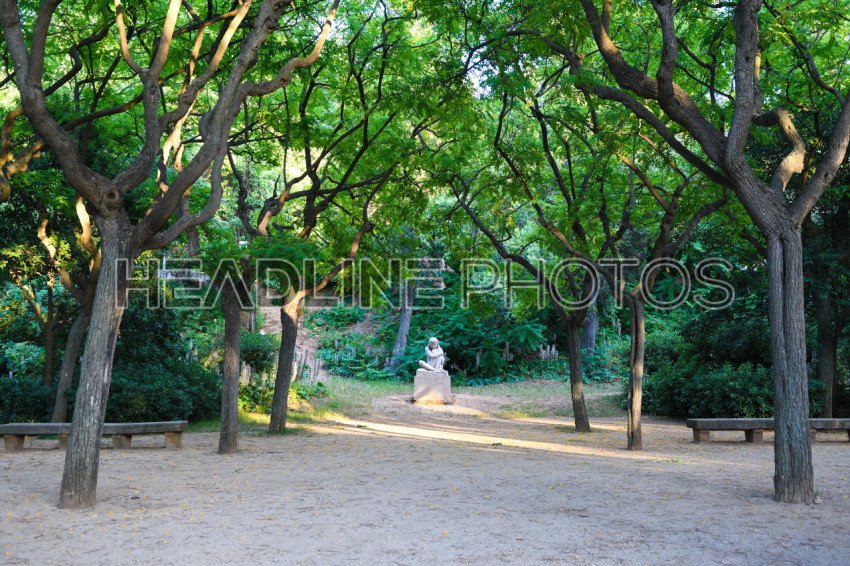 A beautiful park in Spain. A statue is seen in the center of the photo.