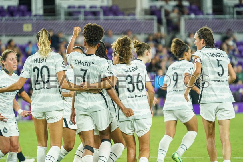 Orlando, Florida, USA, August 14, 2021, Portland Thorns players celebrate after scoring against the Orlando Pride in the second half at Exploria Stadium. (Photo Credit: Marty Jean-Louis)