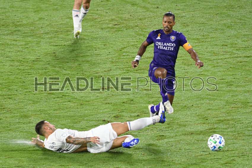 Orlando City SC midfielder Nani #17 leaps to avoid the tackle at Exploria Stadium on Saturday September 19, 2020. Photo Credit: Marty Jean-Louis