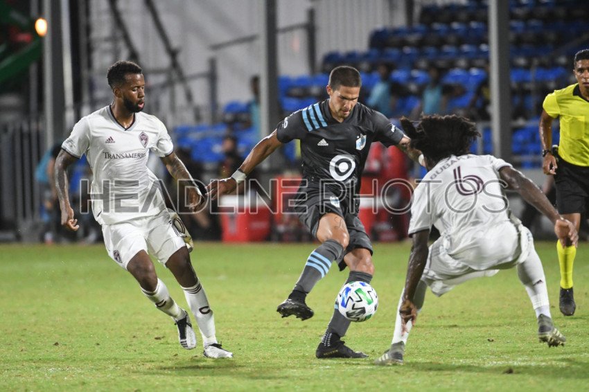 Colorado Rapids and Minnesota United players fight for the ball during the MLS is Back Tournament at ESPN Wild World of Sport in Orlando Florida USA on Tuesday July 22, 2020. Photo Credit: Marty Jean-Louis