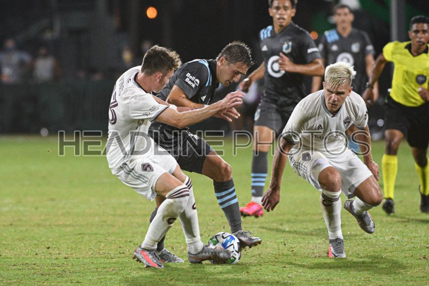 Colorado Rapids and Minnesota United players fight for the ball during the MLS is Back Tournament at ESPN Wild World of Sport in Orlando Florida USA on Tuesday July 22, 2020. Photo Credit: Marty Jean-Louis