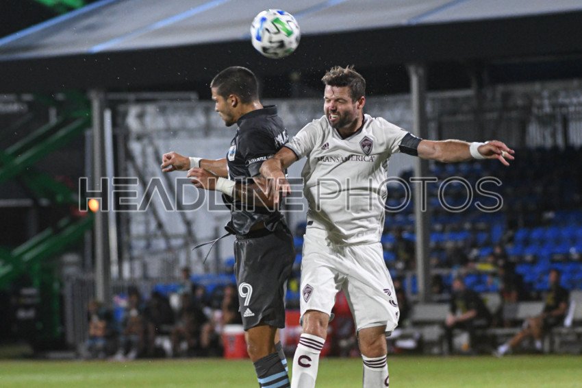 Colorado Rapids defender Moor, Drew #3 and Minnesota United forward Amarilla, Luis #9 fight for the ball during the MLS is Back Tournament at ESPN Wild World of Sport in Orlando Florida USA on Tuesday July 22, 2020. Photo Credit: Marty Jean-Louis