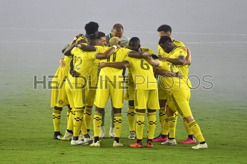 Columbus Crew players huddle before the whistle at Exploria Stadium in Orlando Florida on Wednesday November 4, 2020. Photo Credit: Marty Jean-Louis