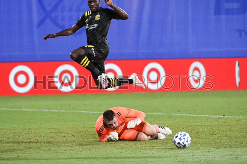 Columbus Crew SC forward Zardes, Gyasi #11 leaps over New York Red Bull's Goalie during the MLS is Back Tournament at ESPN Wild World of Sports in Orlando Florida USA on Thursday July 16, 2020. Photo Credit: Marty Jean-Louis