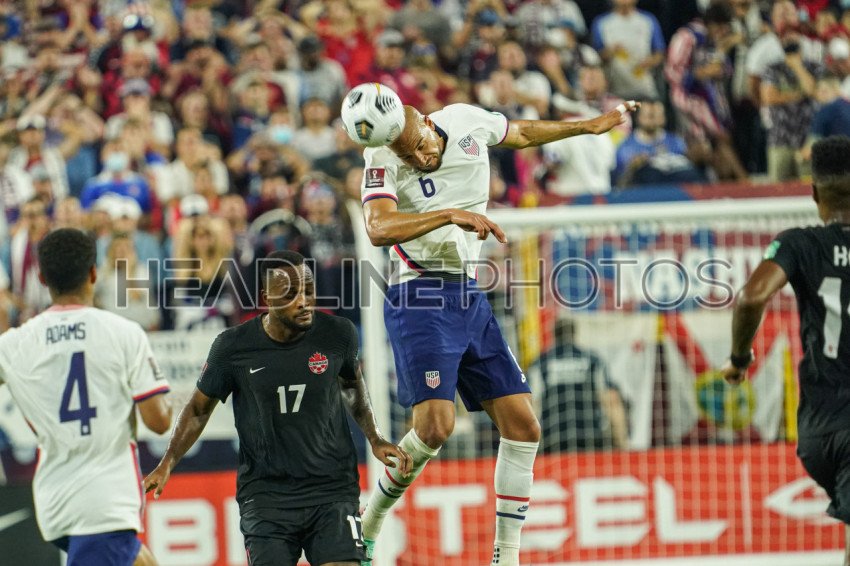 Nashville, Tennessee, USA, September 5, 2021, USA defender John Anthony Brooks Jr. #6 makes a header during the 2022 World Cup Qualifier at Nissan Stadium. (Photo Credit: Marty Jean-Louis)
