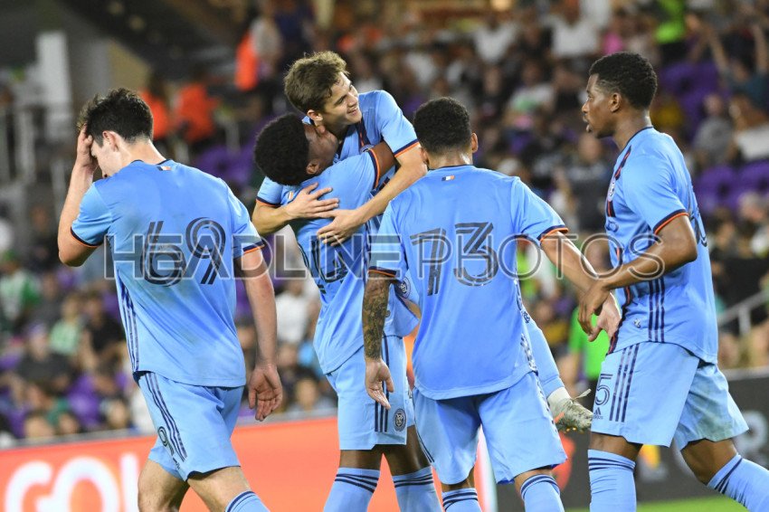 NYCFC players celebrate goal at Exploria Stadium in Orlando Florida on Wednesday January 15, 2020. Photo Credit: Marty Jean-Louis