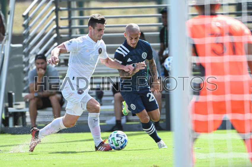 New York City FC and Inter Miami CF players fight for the ball during the MLS is Back Tournament at ESPN Wild World of Sports in Orlando Florida USA on Monday July 20, 2020. Photo Credit: Marty Jean-Louis