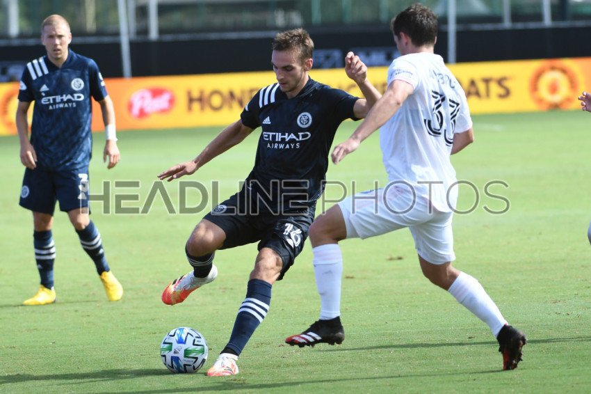 New York City FC defensive midfielder Sands, James #16 fight to keep the ball during the MLS is Back Tournament at ESPN Wild World of Sports in Orlando Florida USA on Monday July 20, 2020. Photo Credit: Marty Jean-Louis