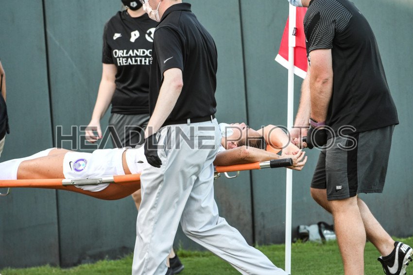 Orlando Pride player Carrie Lawrence #17 is taken away after injury at Osceola County Stadium in Kissimmee Florida on Friday October 9, 2020. Photo Credit: Marty Jean-Louis