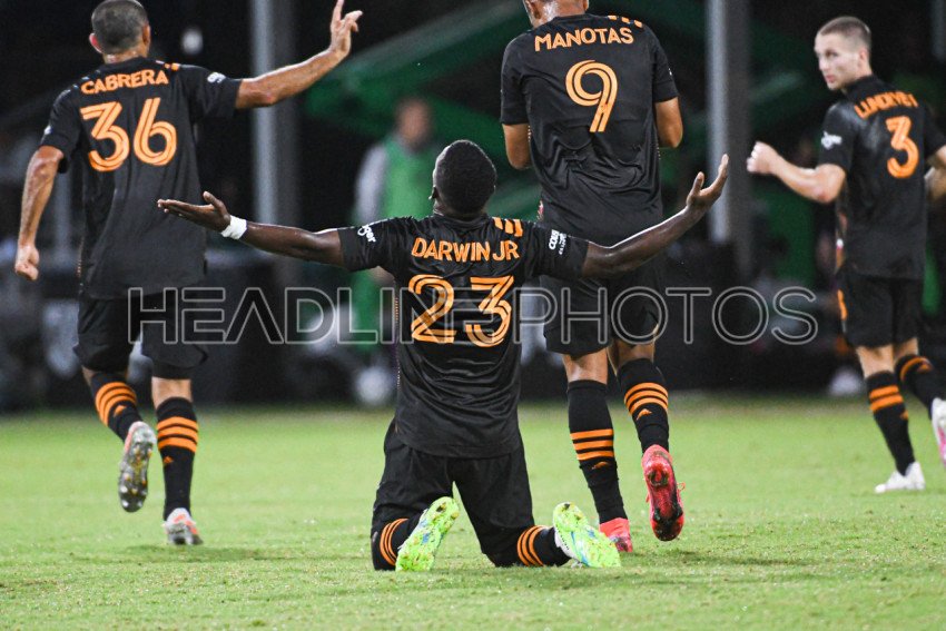 Houston Dynamo forward Quintero, Carlos Darwin #23 kneel to celeberate goal during the MLS is Back Tournament at ESPN Wild World of Sports in Orlando Florida USA on Thursday July 23, 2020. Photo Credit: Marty Jean-Louis