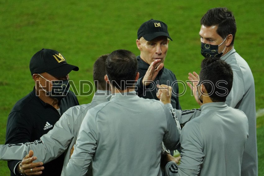 December 16, 2020, Orlando, Florida, USA, LAFC head coach Bob Bradley celebrate win with coaching staff during the CONCACAF quarter finals. (Photo Credit: Marty Jean-Louis)