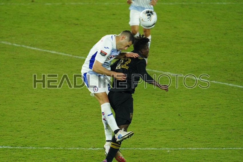 December 16, 2020, Orlando, Florida, USA, LAFC and Cruz Azul players fight for the header during the CONCACAF quarter finals. (Photo Credit: Marty Jean-Louis)
