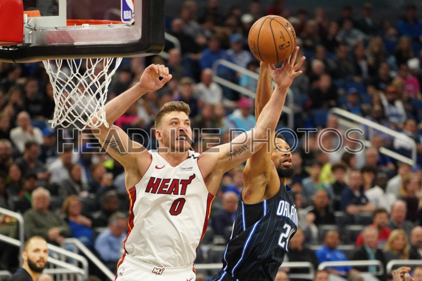 Orlando Magic player Khem Birch #24 and Miami Heat player Meyers Leonard #0 fight for the rebound at the Amway Center in Orlando Florida on Saturday February 1, 2020. Photo Credit: Marty Jean-Louis